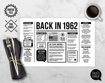 Back in 1962 Newspaper Poster Printable 62nd Birthday Decoration 1962