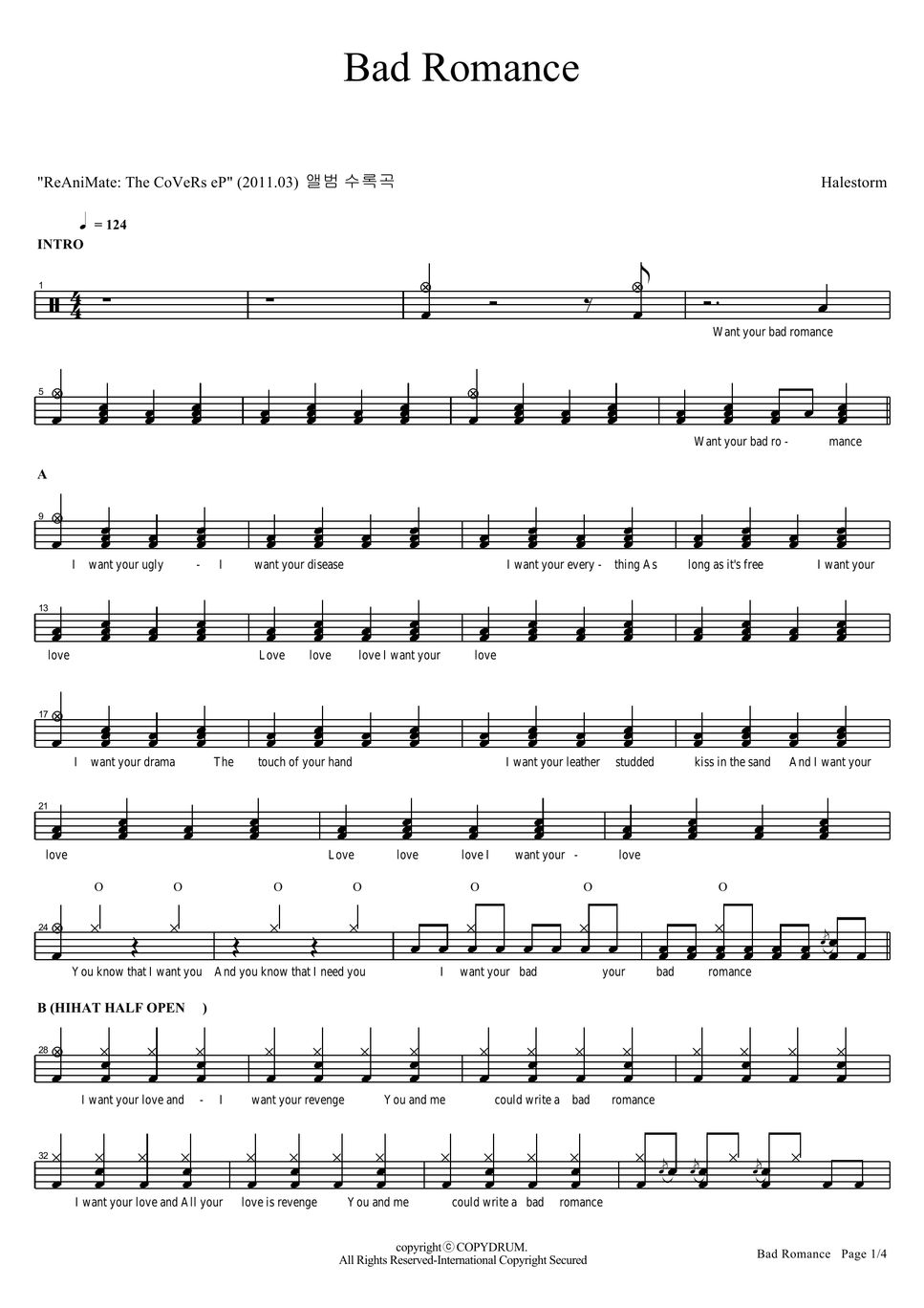 Halestorm Bad Romance 악보 by COPYDRUM