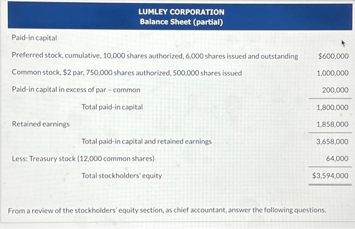 LUMLEY CORPORATION Balance Sheet (partial) Paid in Chegg com