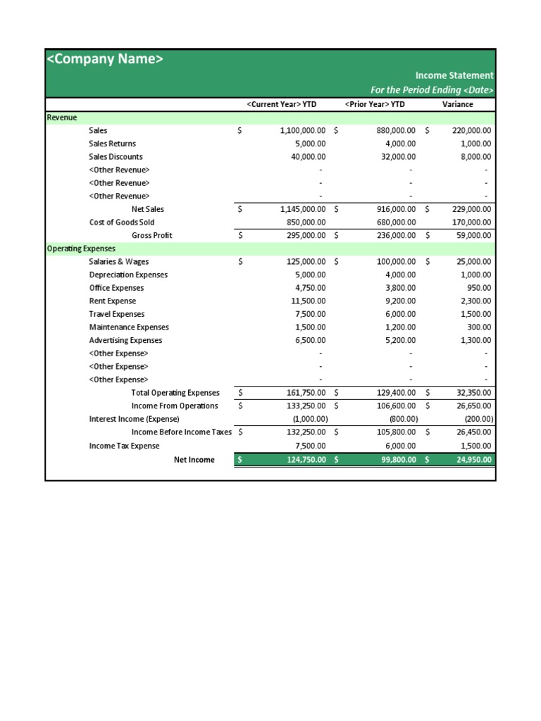 Profit and Loss Statement Template With Prior Year Comparison P L