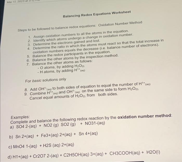 SOLUTION: CHEM 22 Balancing Redox Equations Worksheet Studypool
