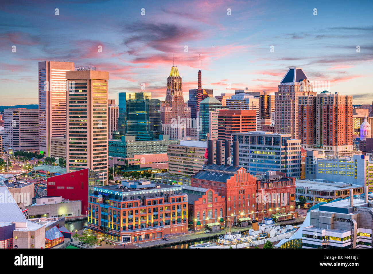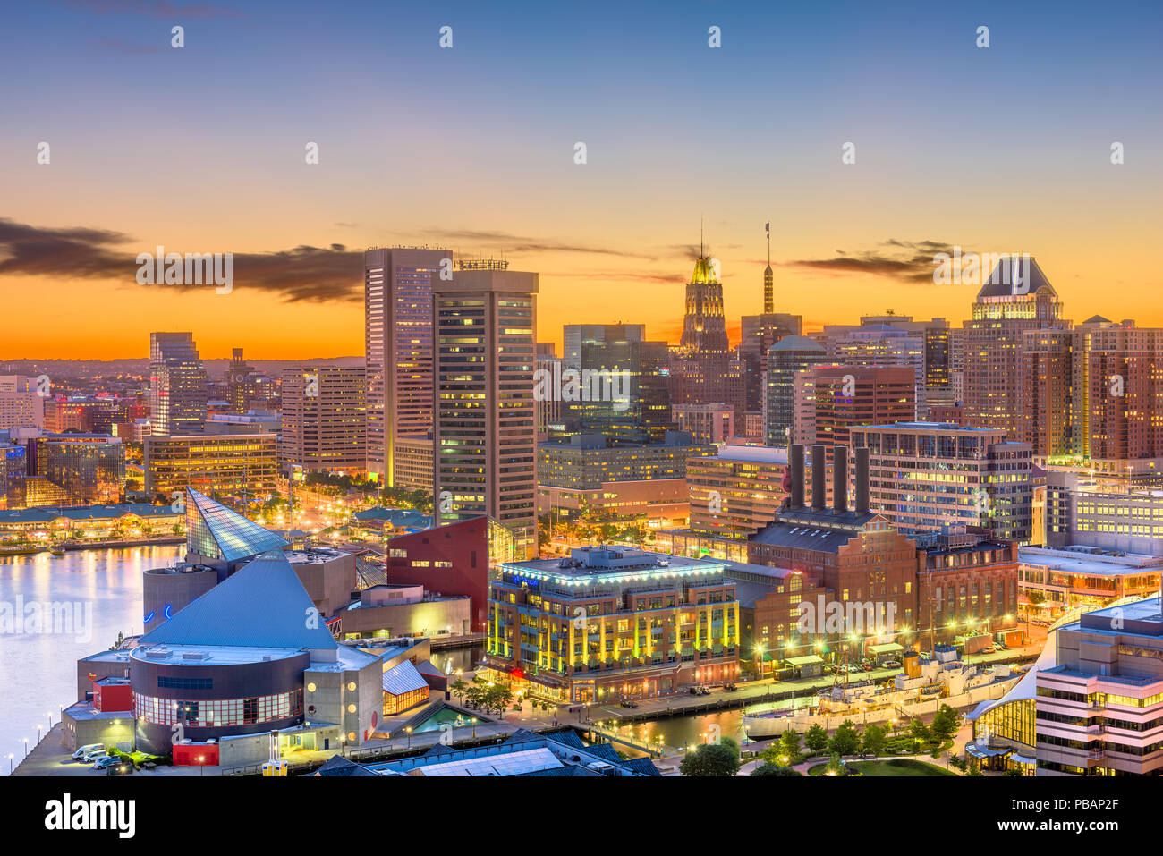 Baltimore Maryland USA inner harbor and downtown skyline at dusk