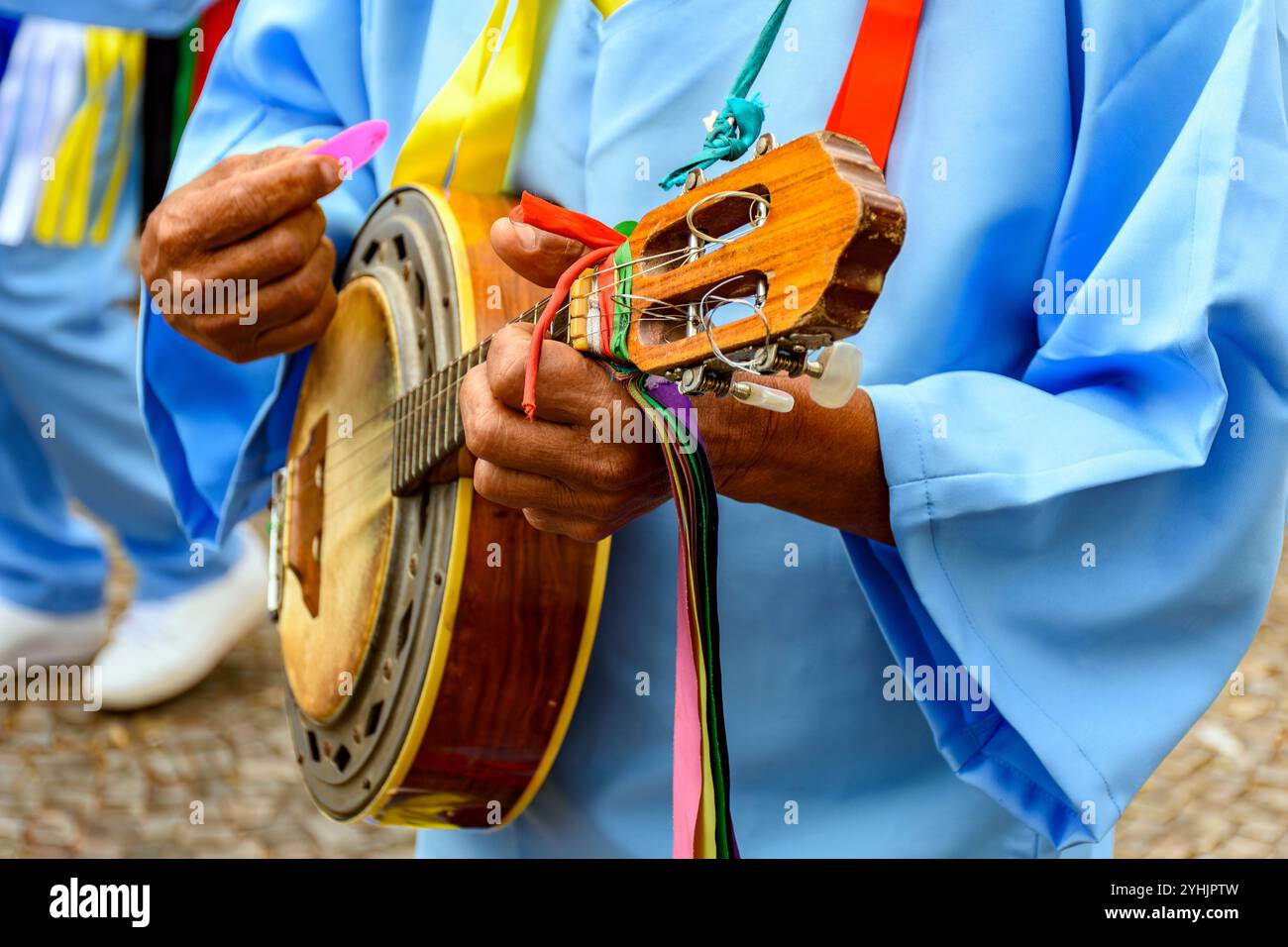 Hands of banjoist on the streets of Brazil wearing colorful clothes