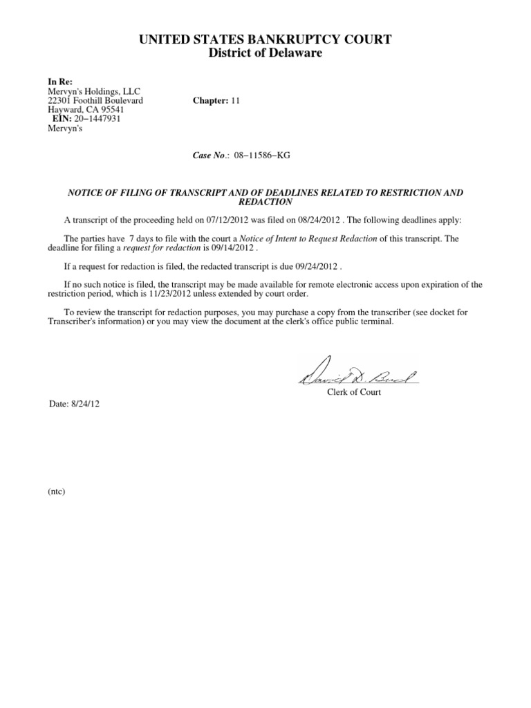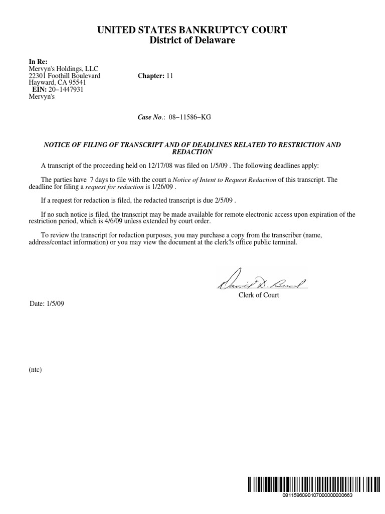 In Re: Mervyn #39 s Holdings LLC Et Al Case No 08 11586: United States
