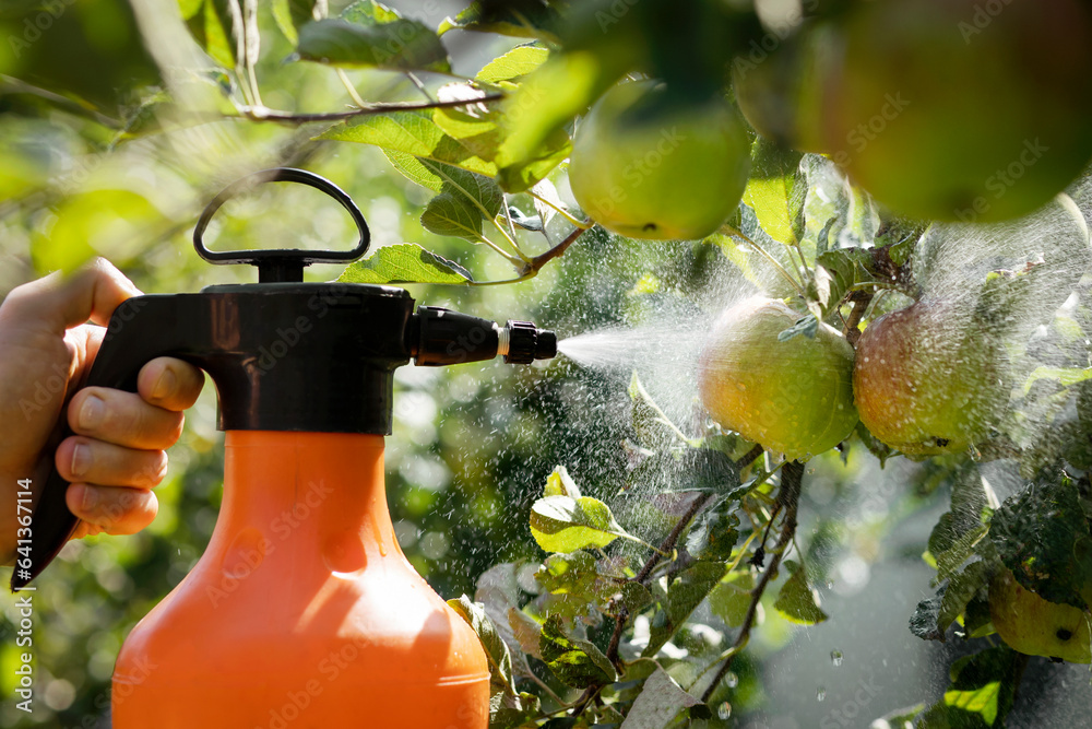 Premium Photo Spraying pesticides apple tree with spray bottle copy