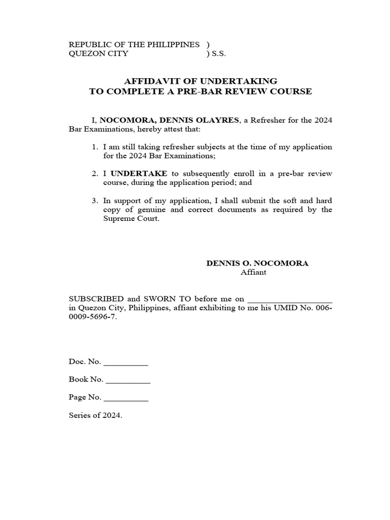 Affidavit of Undertaking To Complete A Pre Bar Review Course PDF