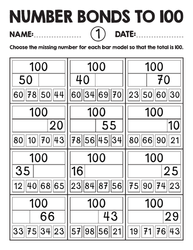 Number bonds to 100 bar model worksheets : addition to make a hundred