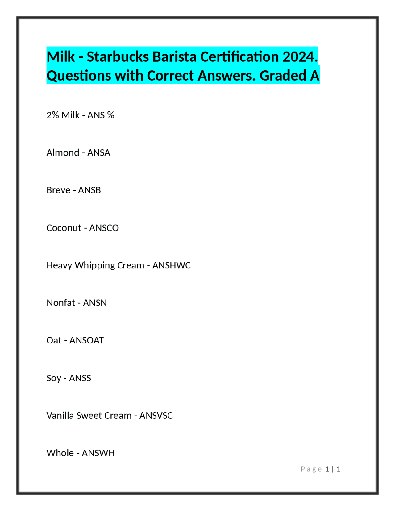 Milk Starbucks Barista Certification 2024 Questions with Correct