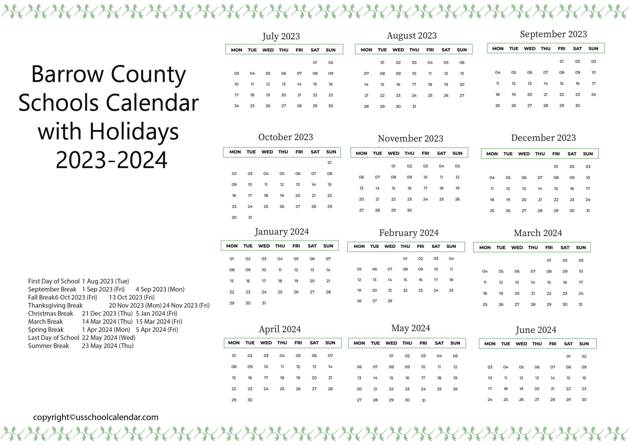 Barrow Schools Calendar US School Calendar