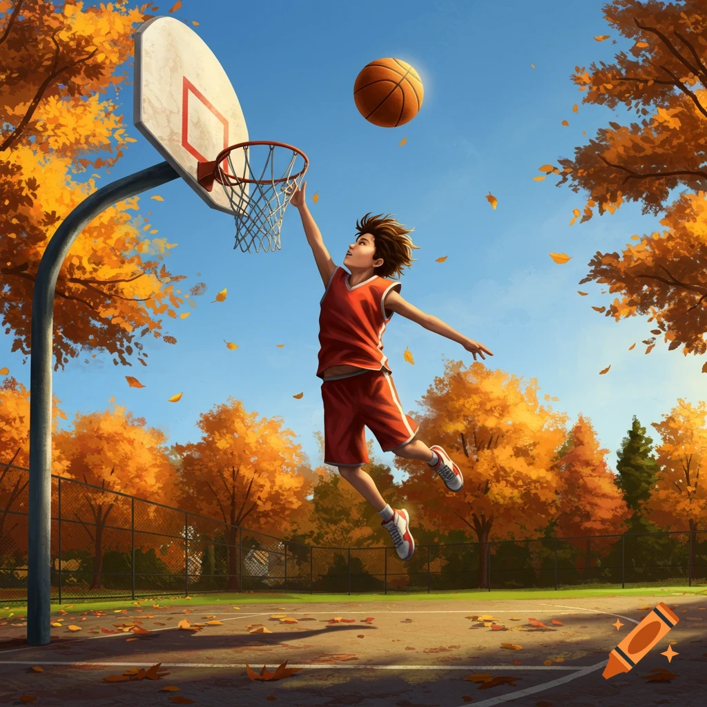 The colorful basketball court features red and green surfaces under a