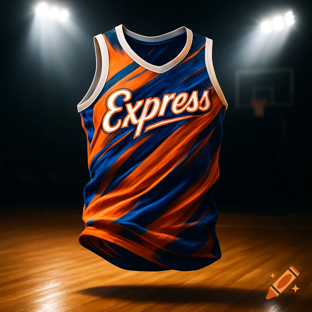 A blue and orange basketball jersey with #39 Express #39 on it floats over a