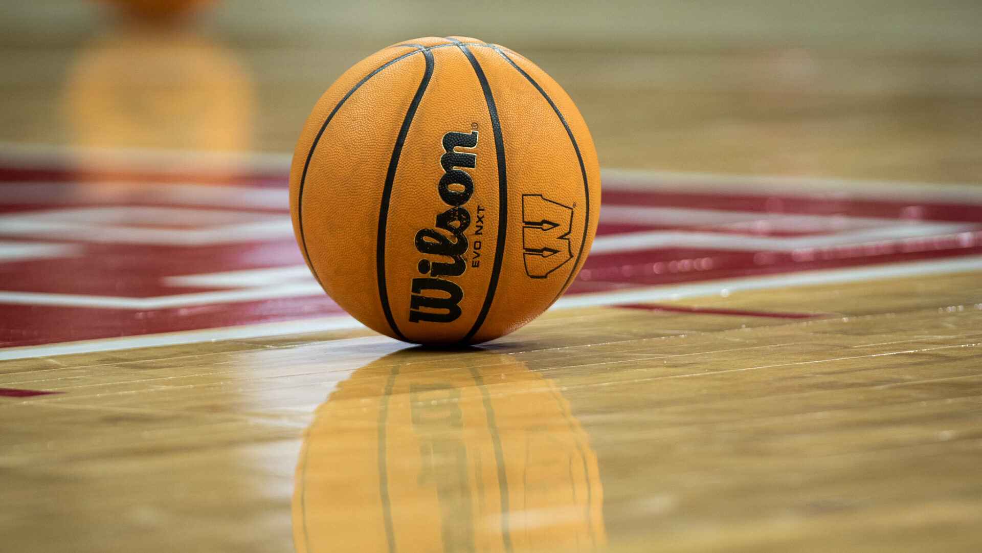 Basketball on Wooden Court Surrounded by Blurred Players and Equipment