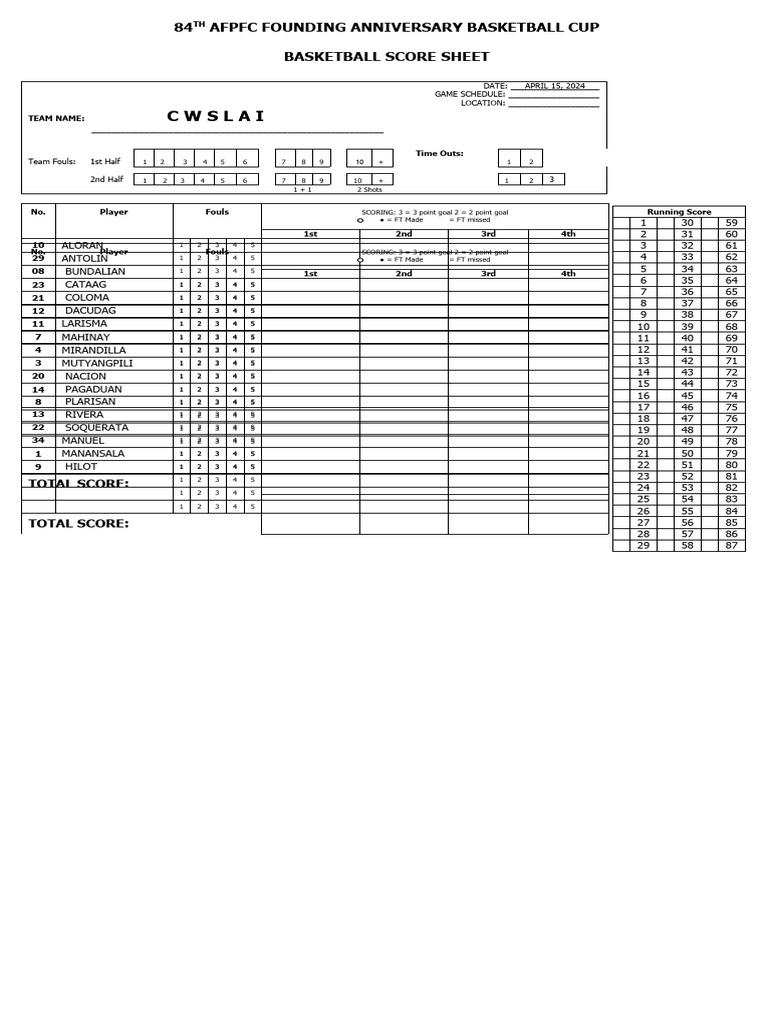 Editable Template For Basketball Scoreboard Download Free PDF