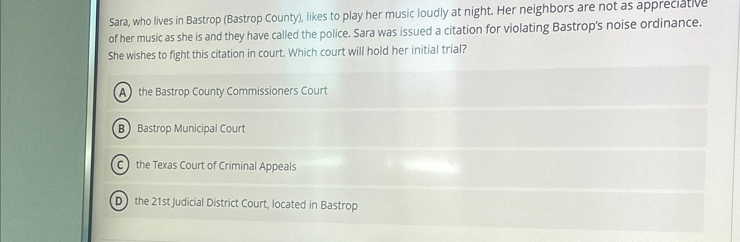 Solved Sara who lives in Bastrop (Bastrop County) likes Chegg com