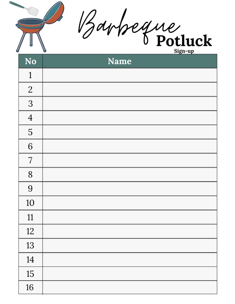 Potluck Sign up Sheet BBQ Potluck Sign up Sheet Barbeque Potluck