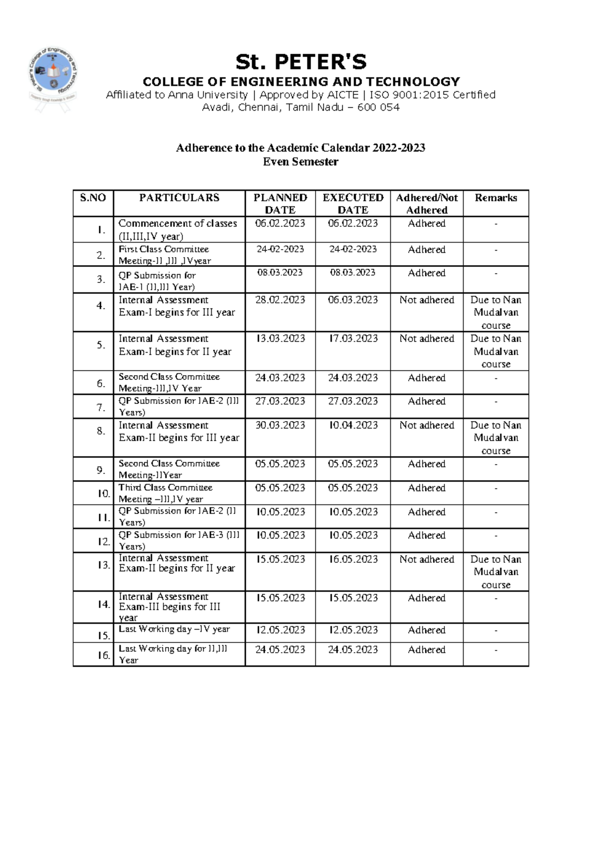 Adherence TO academic calendar 22 23 even St PETER #39 S COLLEGE OF