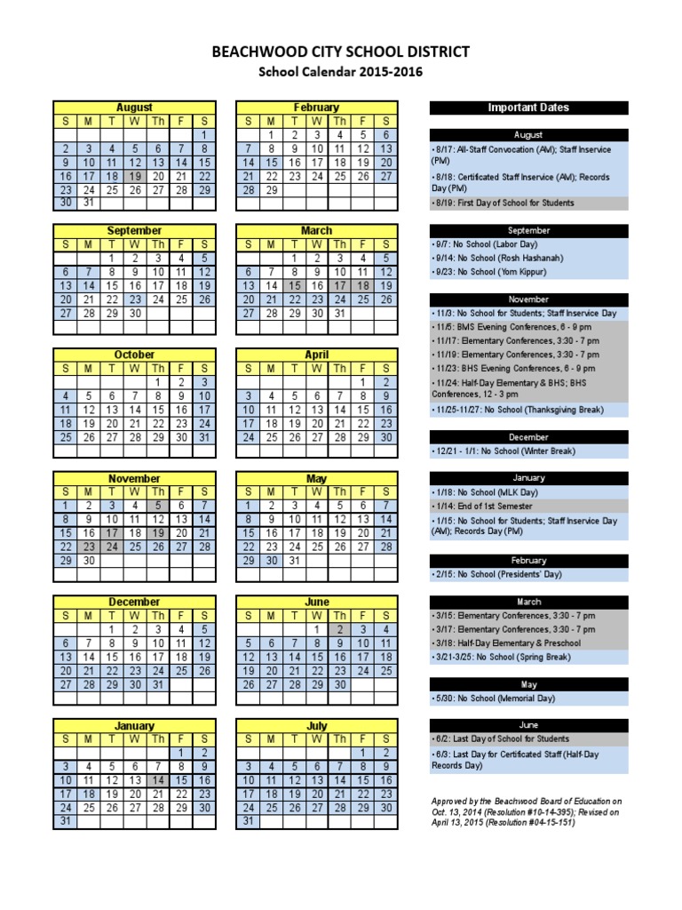 2015 2016 Beachwood Schools Calendar PDF