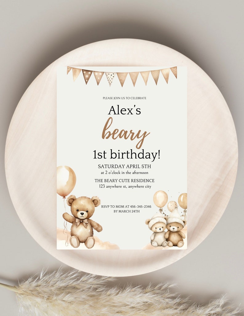 Editable Beary First Birthday Invitation Printable and Digital 5x7 in