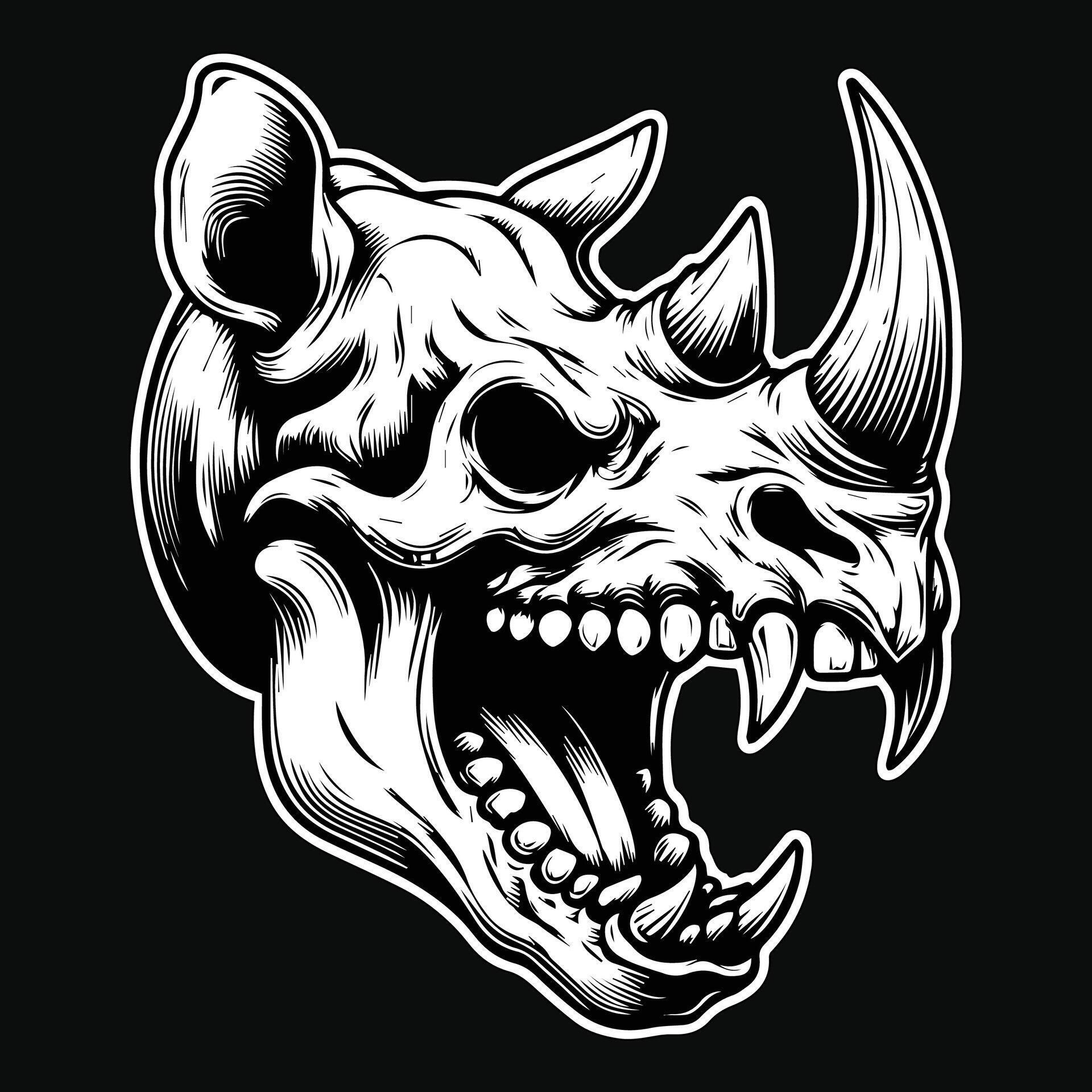 Dark Art Beast Rhino Skull Head with Sharp Fang and Horn Black and