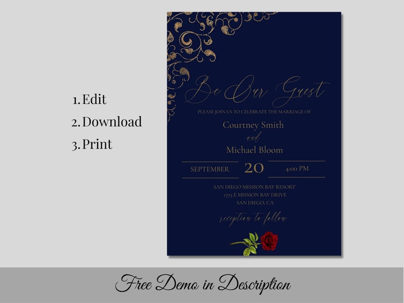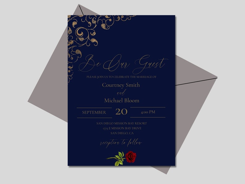 Beauty and the Beast Wedding Invitation Template Dark Blue Etsy