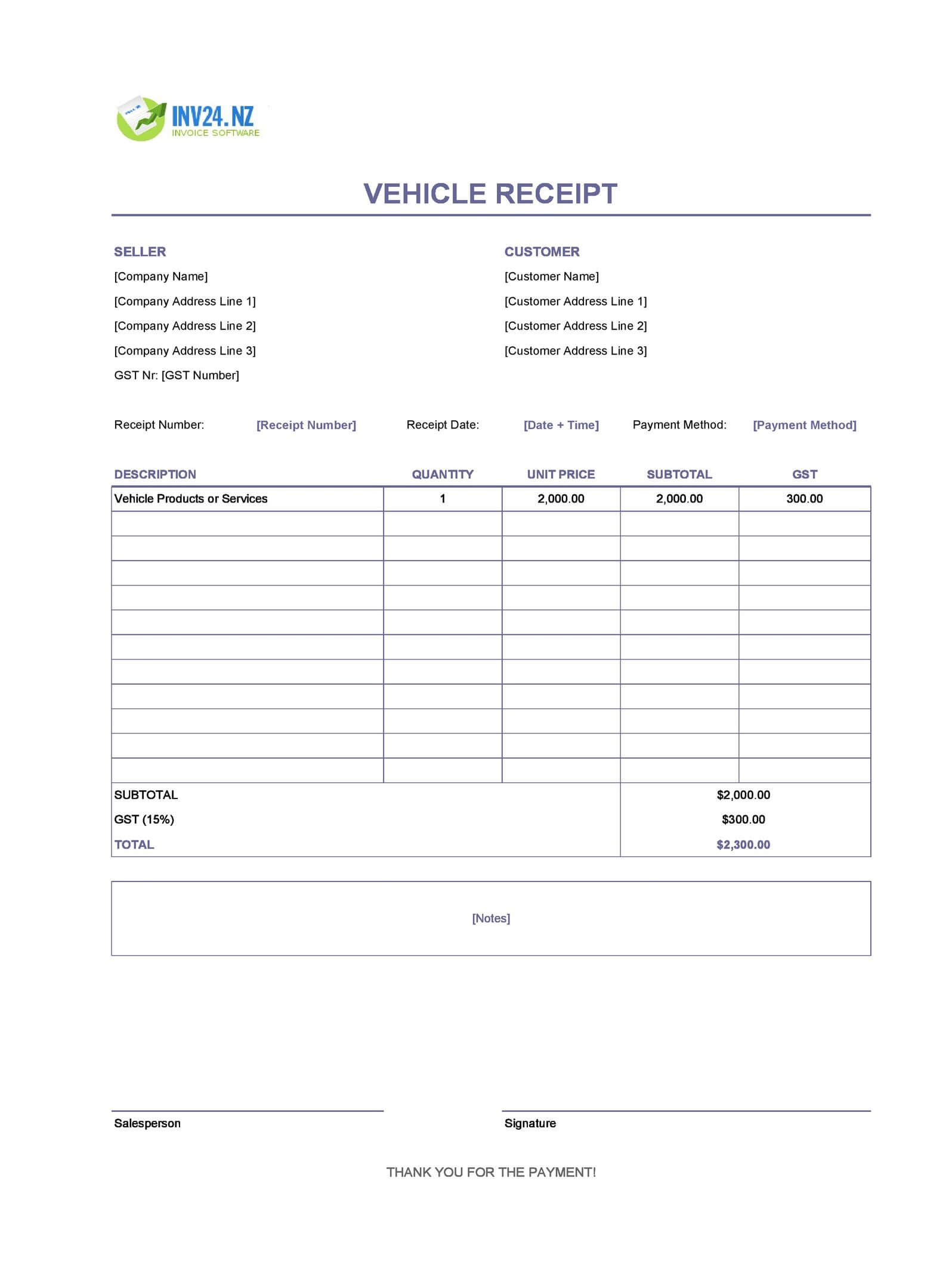 Vehicle Receipt Template for New Zealand (Excel / Google Sheets)