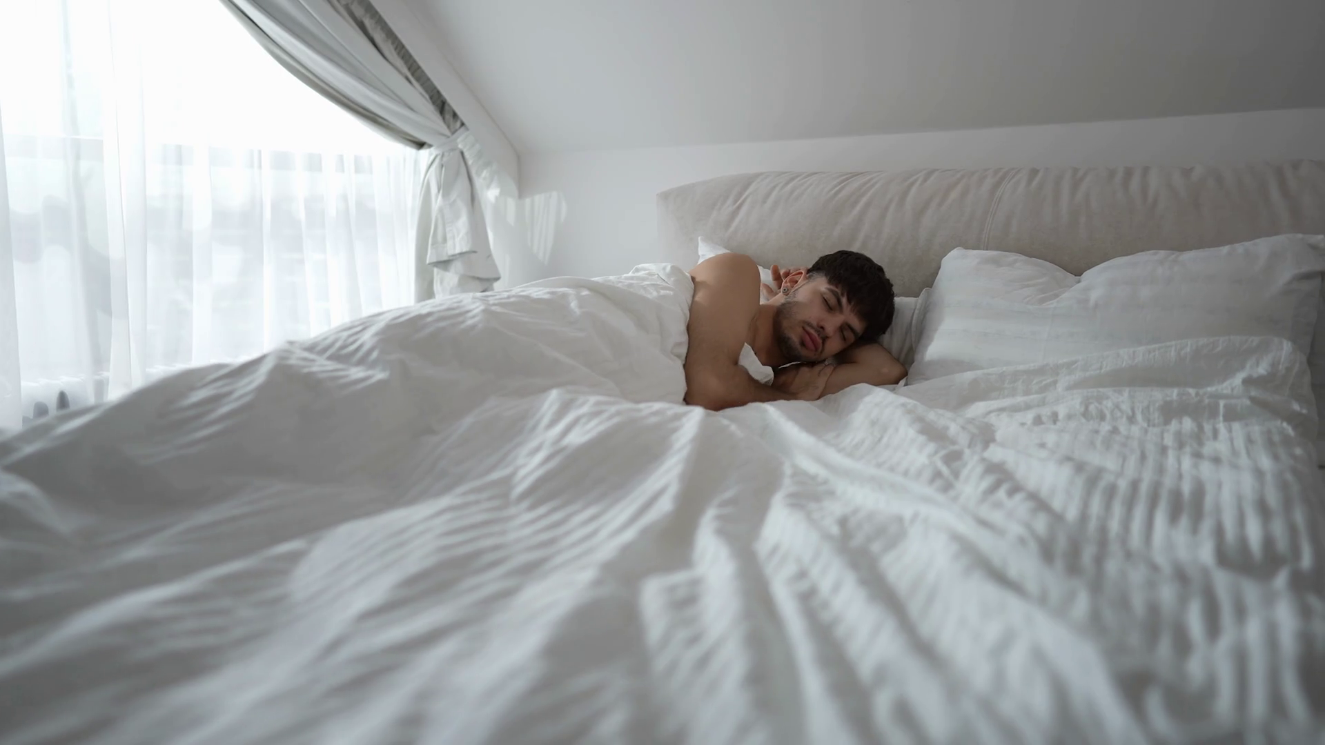 Wide Shot Sleeping Man Waking Up In Bedroom Stock Footage SBV 346696594