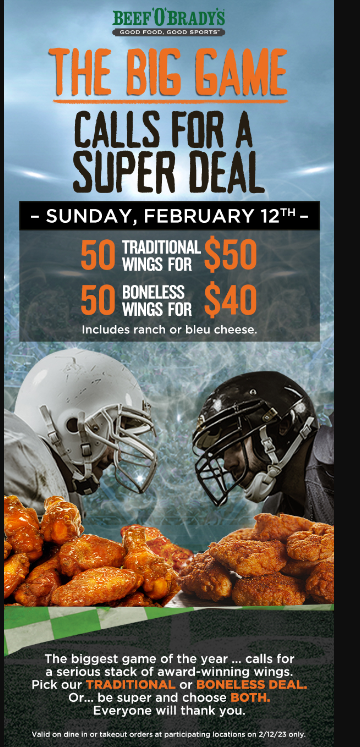 Beef O Bradys Coupon Code: Superbowl Sunday February 12th 50 Tradition