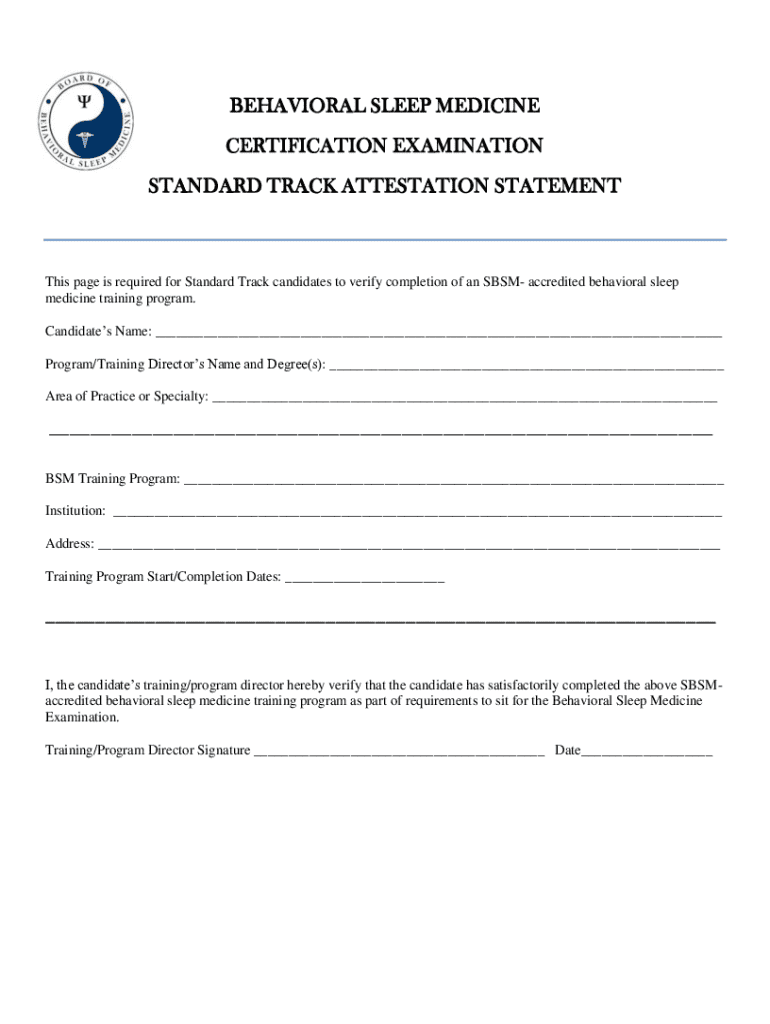 Fillable Online Behavioral Sleep Medicine Certification Examination Fax