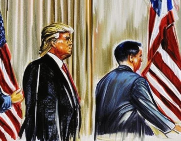 Donald Trump in court room being arraigned on election charges AI