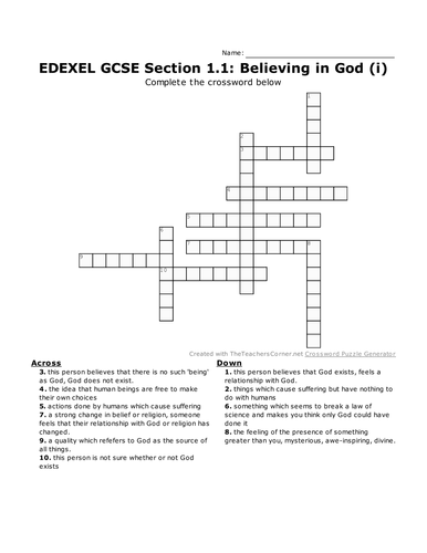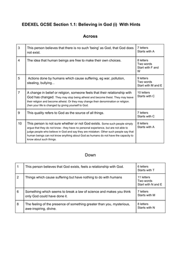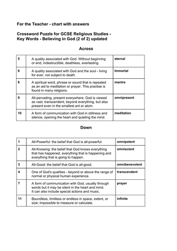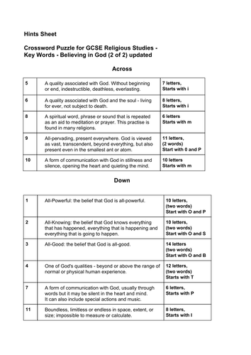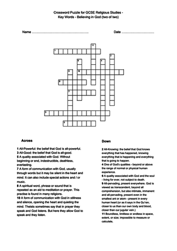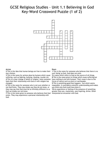 Believing in God Key Word Crossword for GCSE Religious Studies Unit 1 1