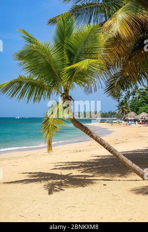 A palm tree bends over a sandy beach on Samet islands Thailand Stock
