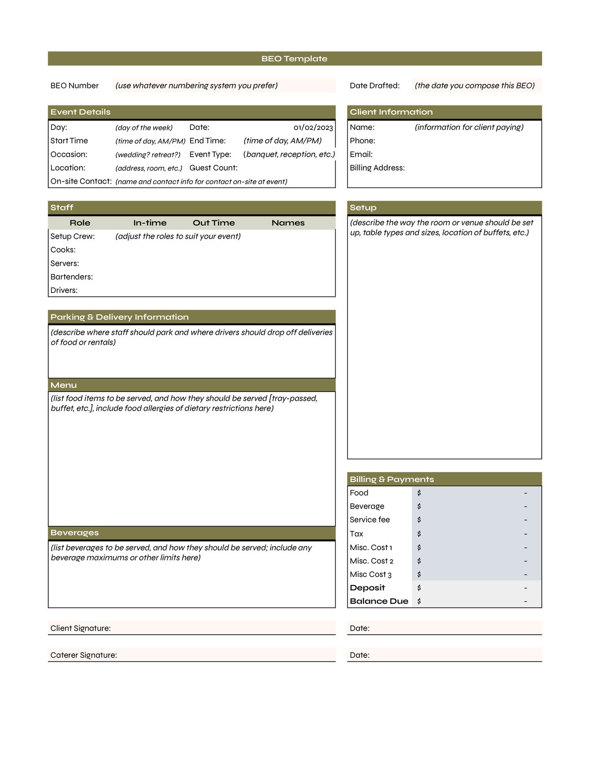 Banquet Event Order (BEO) Tips Free Downloadable Template
