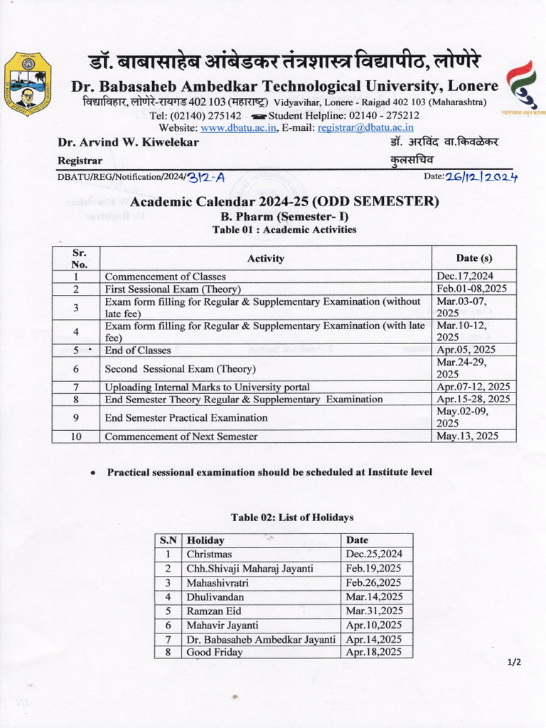 Academic Calender Sem I PDF