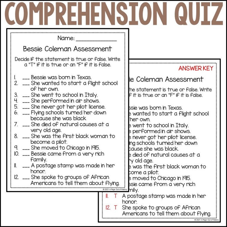 Bessie Coleman Biography Comprehension Worksheets Reading Passages
