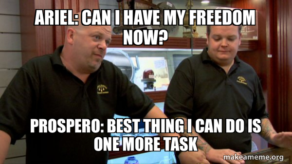 Ariel: Can I Have my Freedom Now? Prospero: Best thing i can do is one