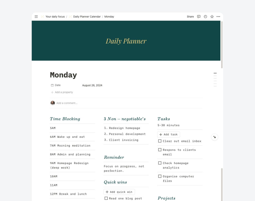 Notion Planner With Time Blocking Tasks and Quick Wins Custom