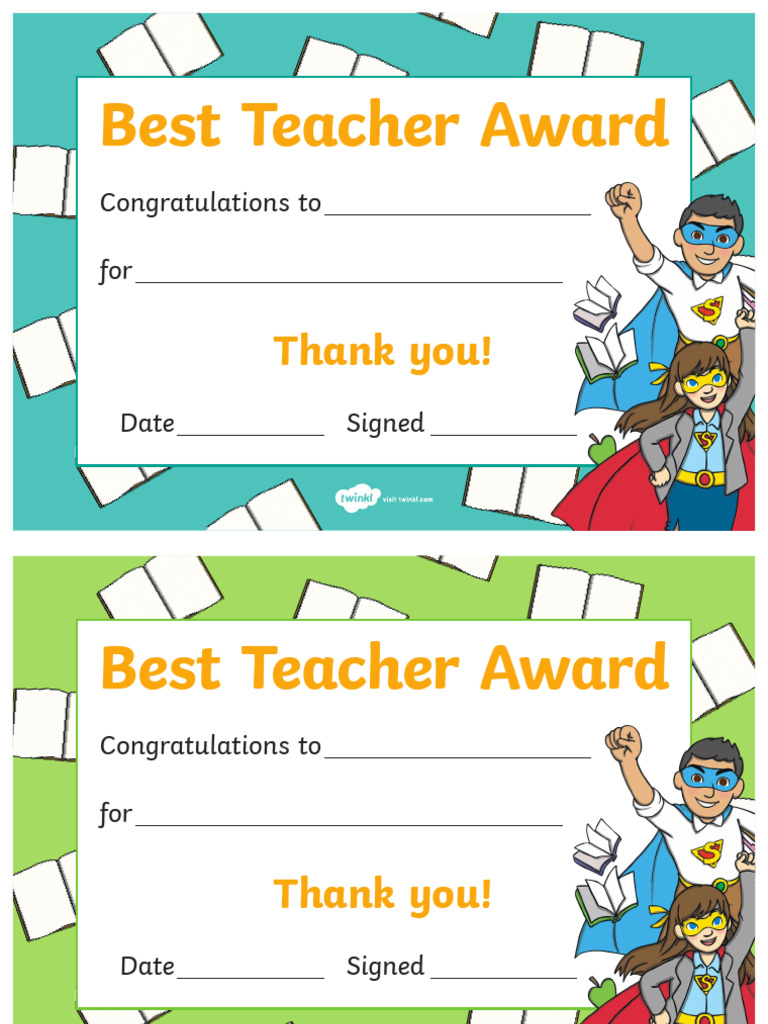 Best Teacher Award Certificate End of School Year Appreciation Gift