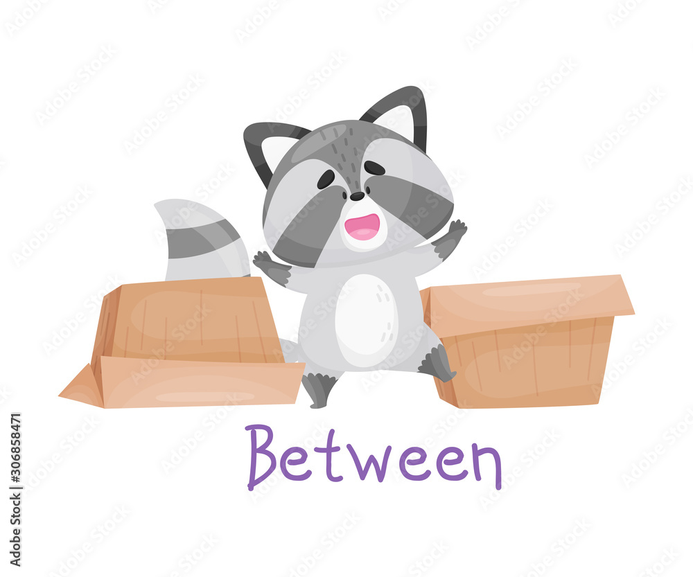 Cute Cartoon Raccoon Between Two Boxes With Handwritten Inscription