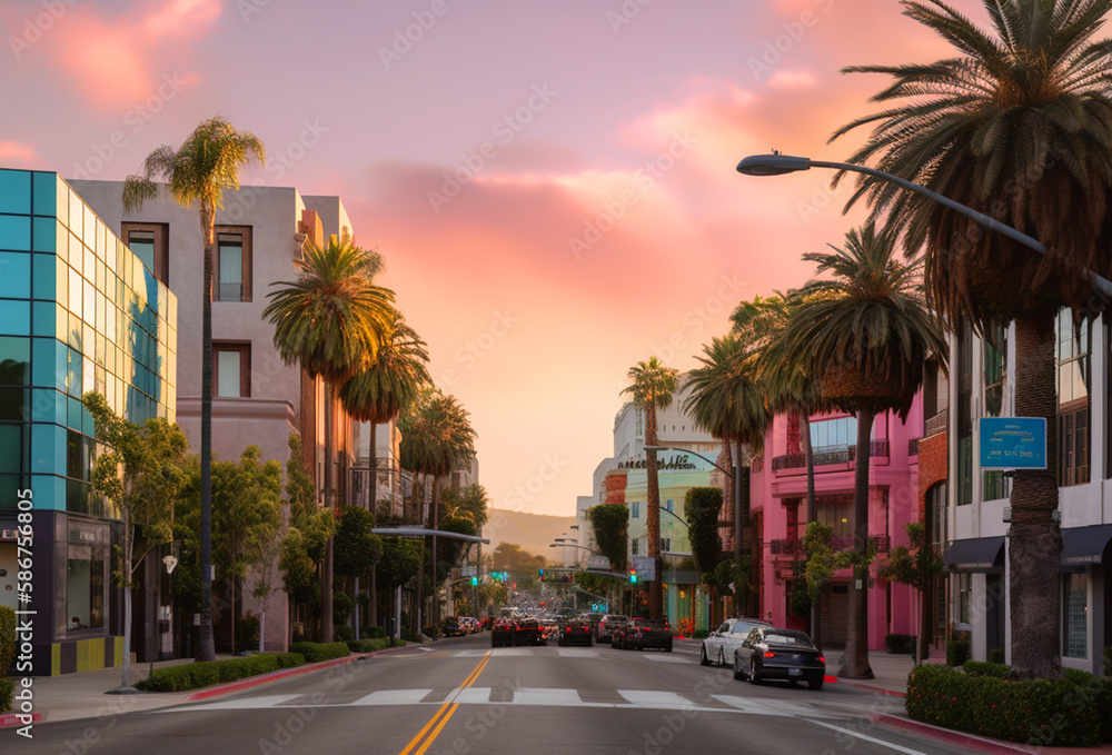Beverly Hills on sunset Car traffic on street in city of California