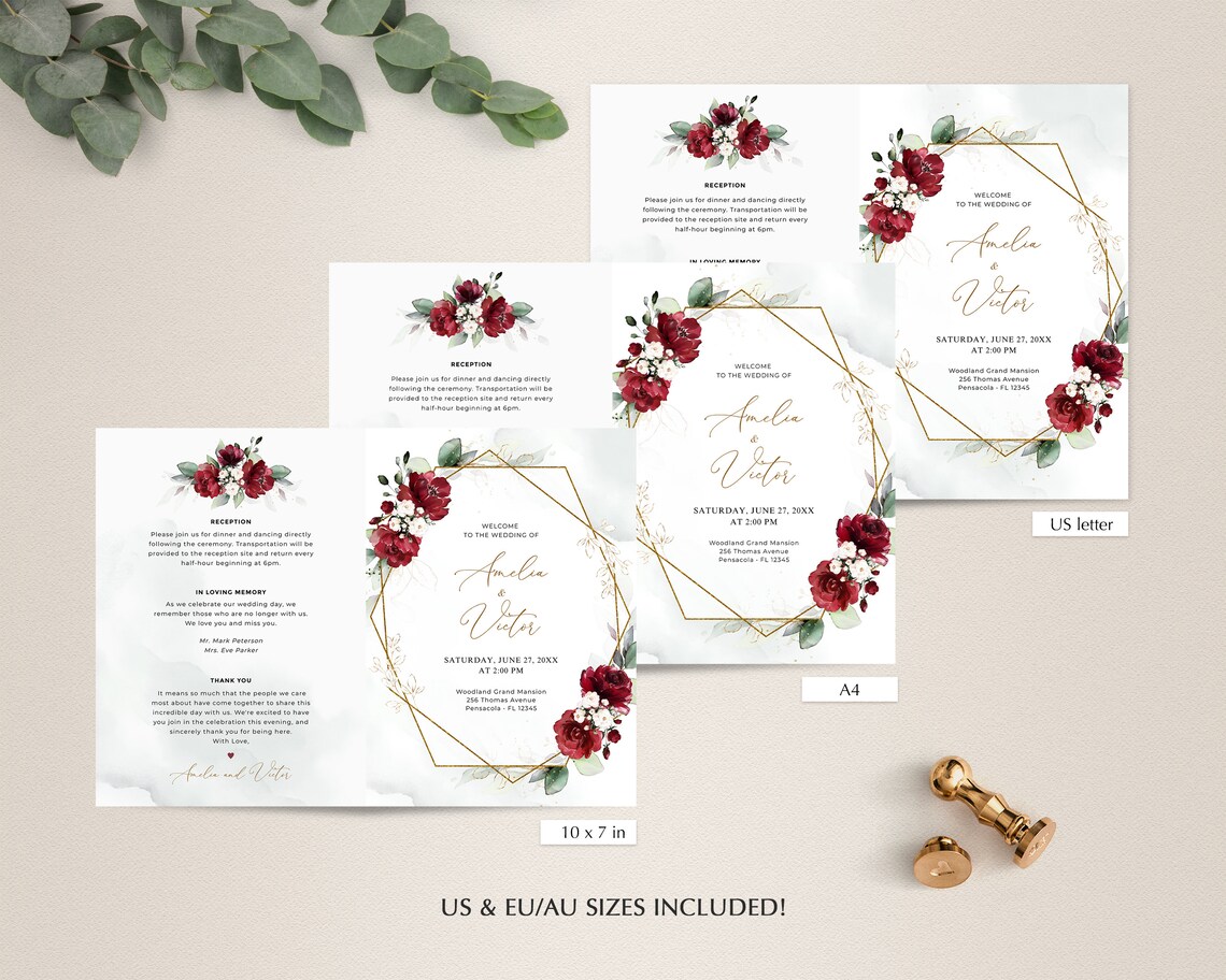 Bi fold Wedding Program Template With Burgundy Roses Wedding Etsy UK