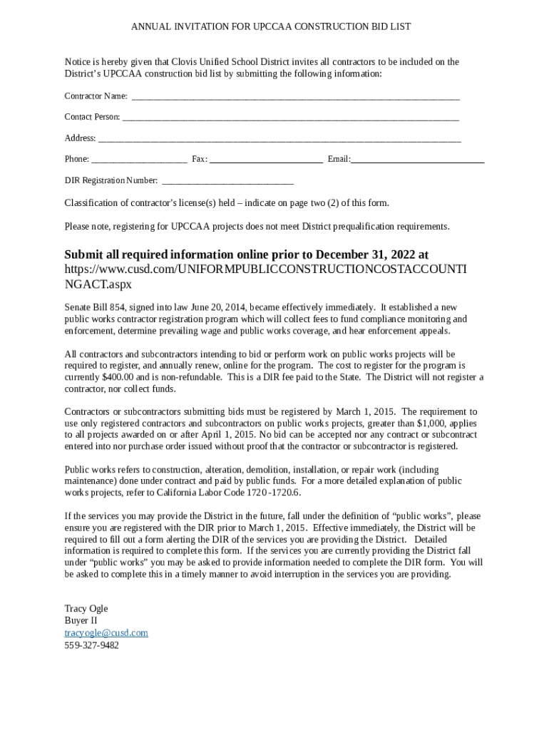Annual Invitation for UPCCAA Construction Bid List Doc Template pdfFiller