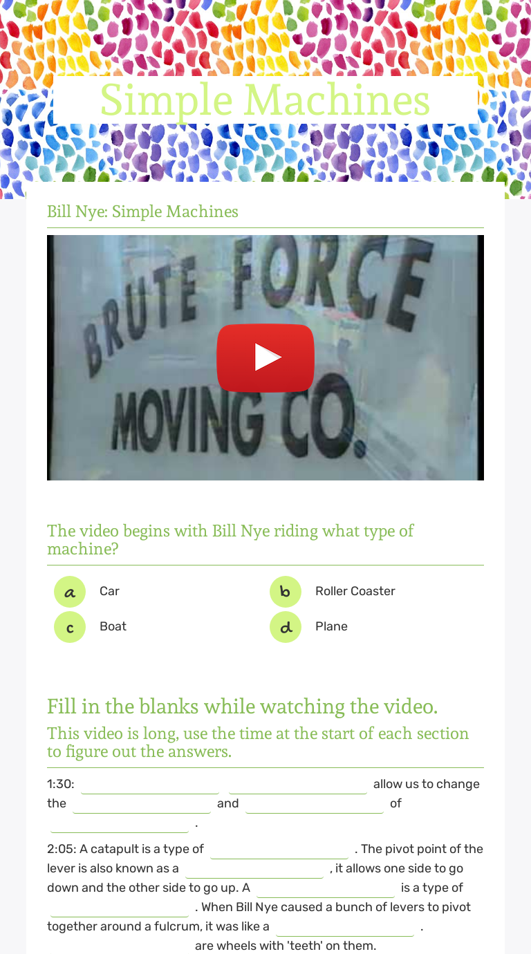Bill Nye: Simple Machines Worksheet Kahoot and commercial free video