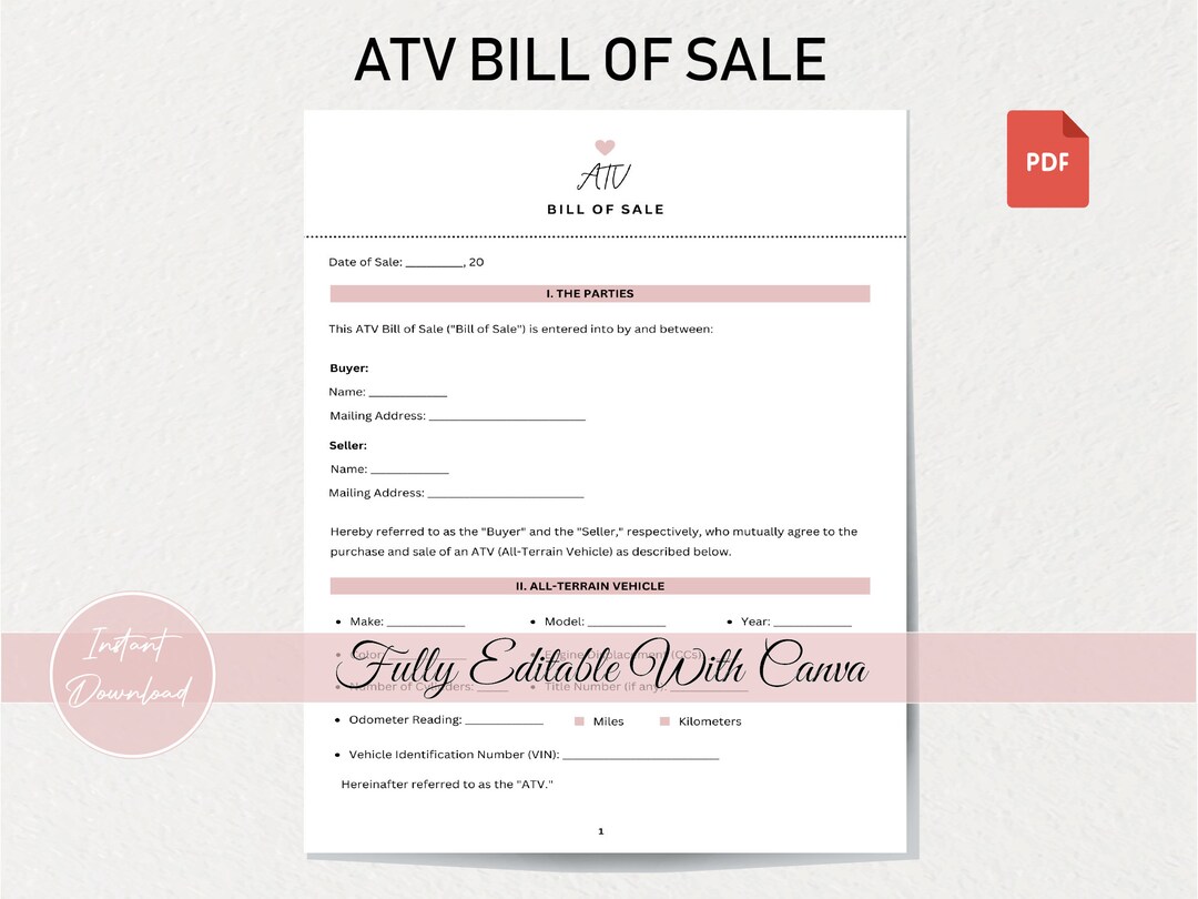 Complete ATV Bill of Sale Template Legal Document Instant Download