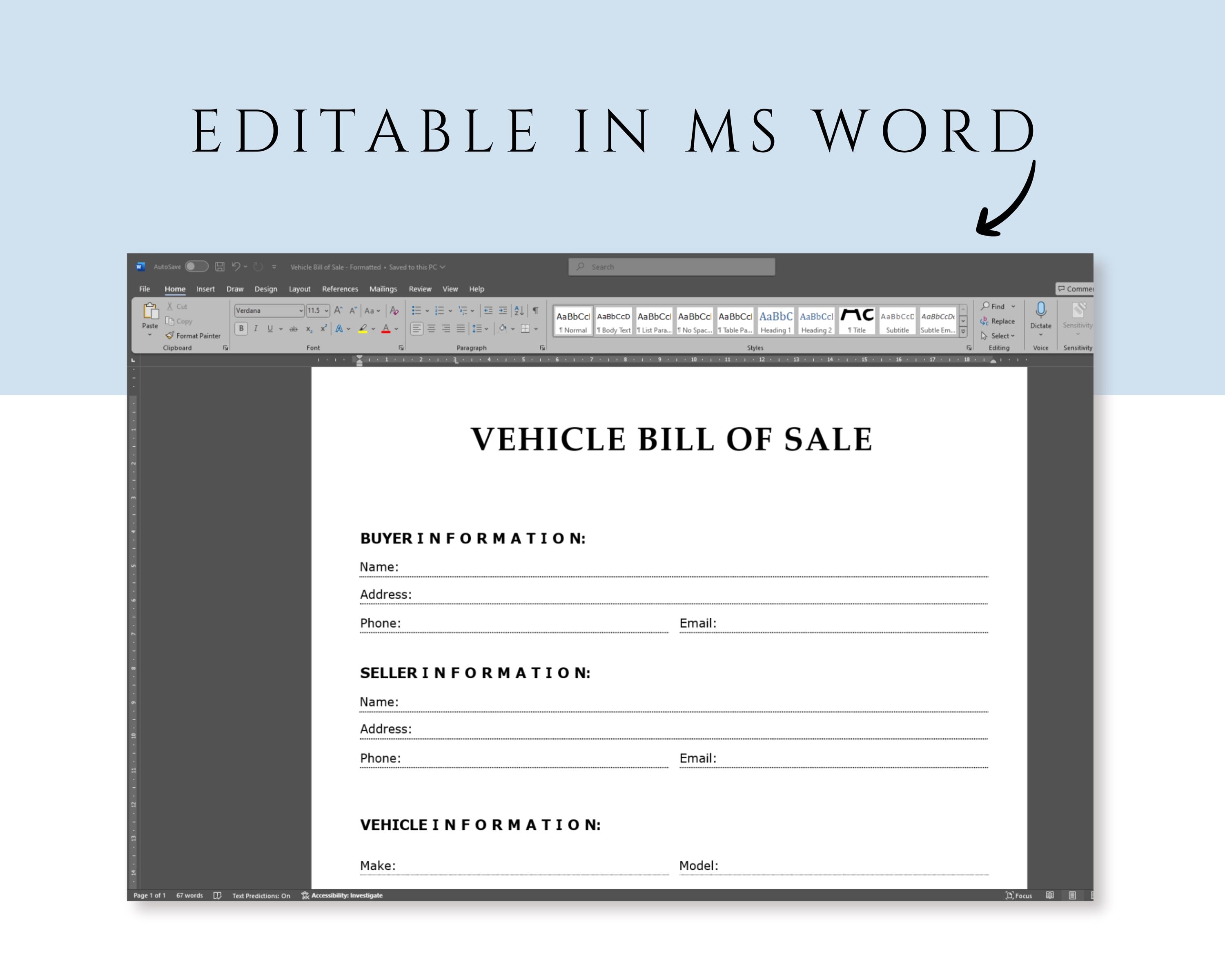 Vehicle Bill of Sale Template Editable Vehicle Bill of Sale MS Word