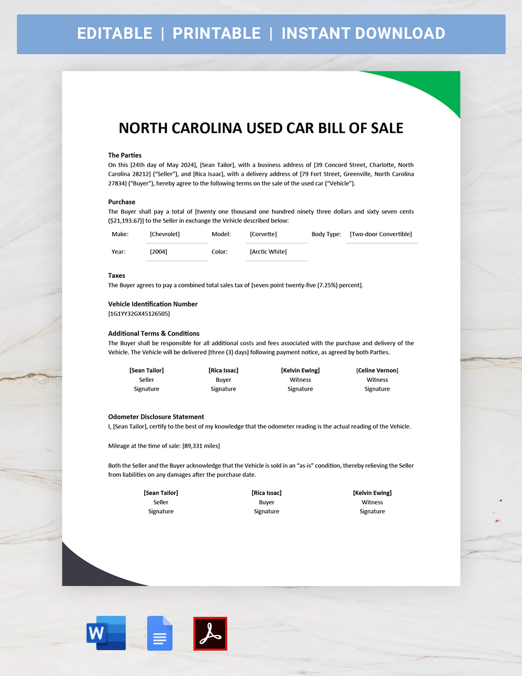 Free North Carolina (NC) Car Bill of Sale Forms PDF Word