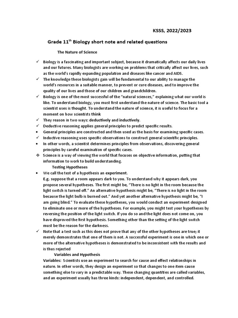 Grade 11th Biology Work Sheet PDF Hypothesis Experiment