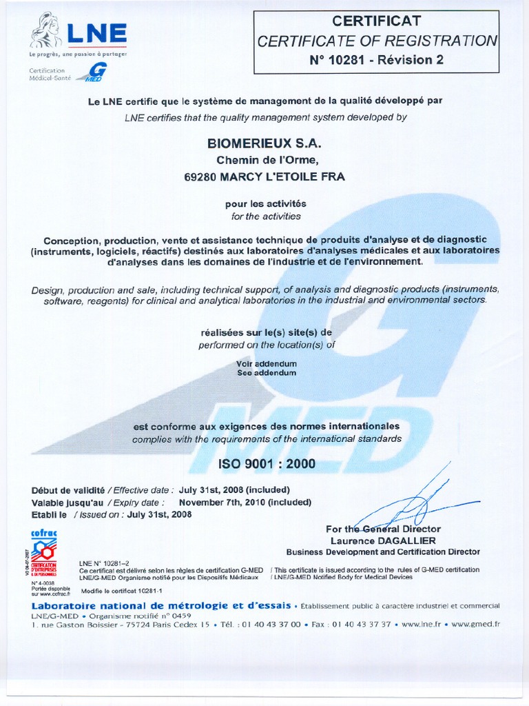 ISO 9001 Certificate LNE GMED BioMerieux FRANCE Marcy Craponne La Balme