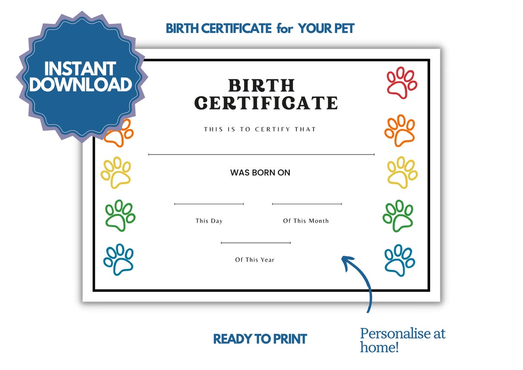 Puppy Birth Certificate Instant Download Printable Pet Birth