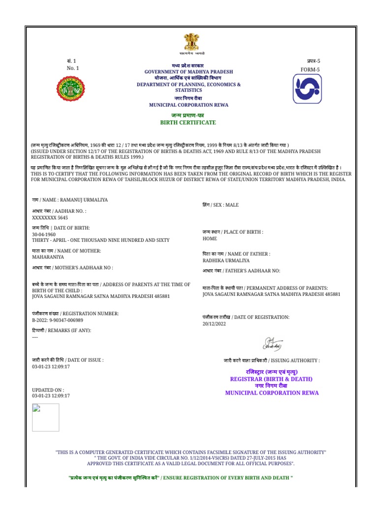 सं 1 No 1 प 5 FORM 5: Birth Certificate PDF