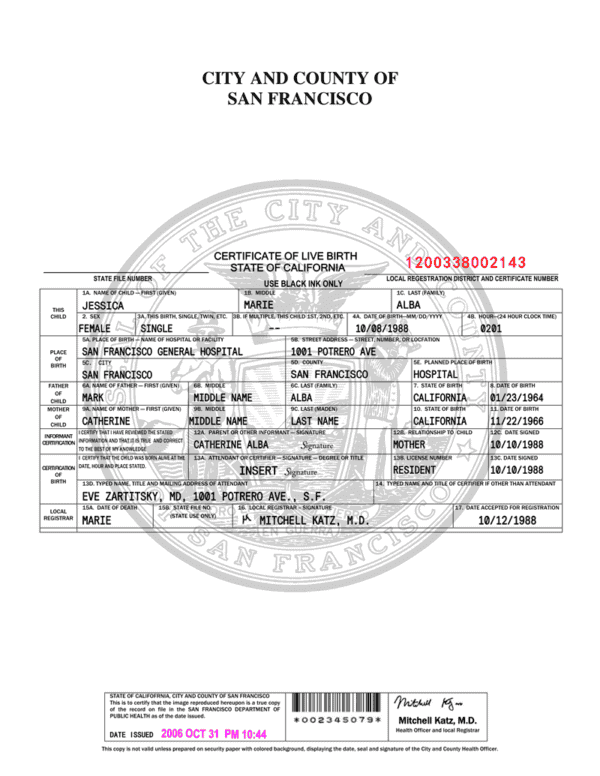 Certificate of Live Birth in San Francisco Jessica Alba Course Hero